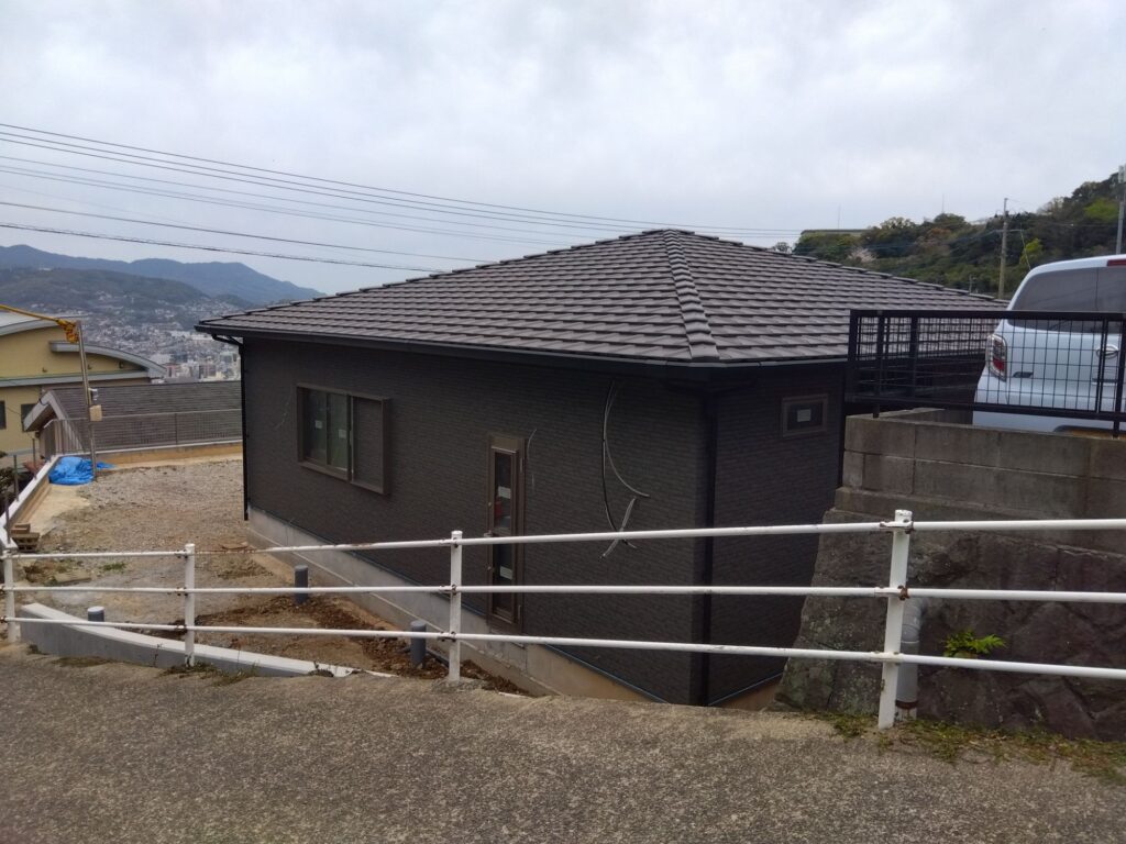 上棟日の天気が心配していた現場も無事完成に近づいてきました。今回の物件は自社設計で長い時間打合せしてきました。少しずつ改良しながら設計修正を繰り返し良いプランを提示出来たと思っております。お施主様も住まわれるのを大変心待ちにしています。これから外構の駐車場を作っていきます。