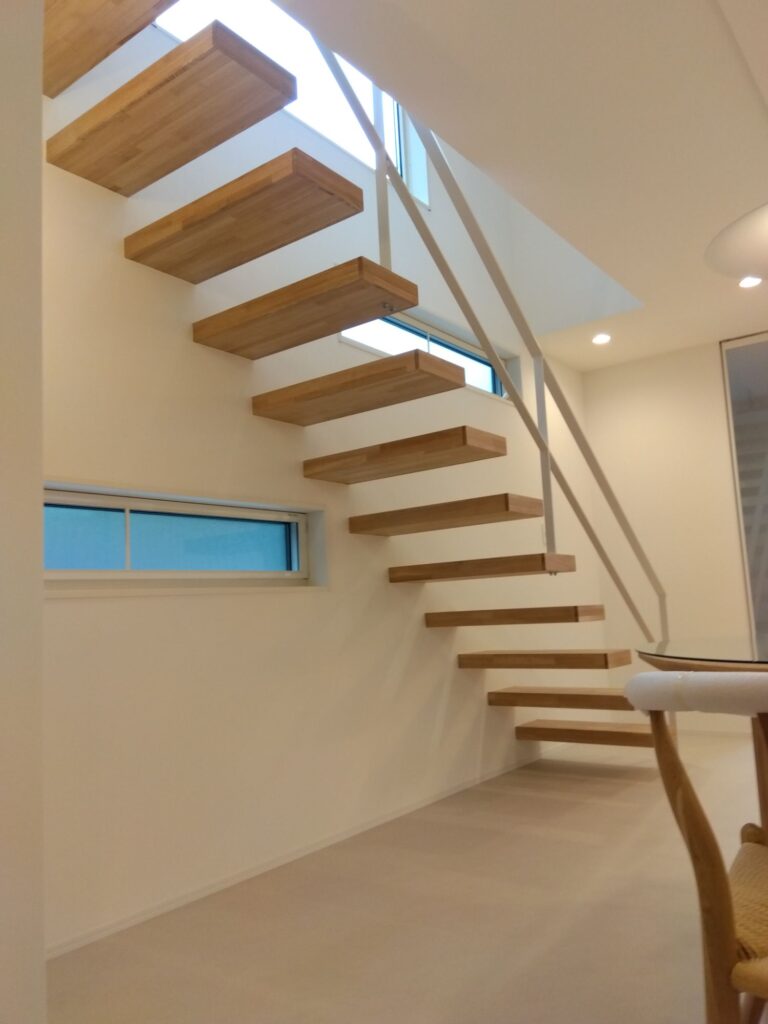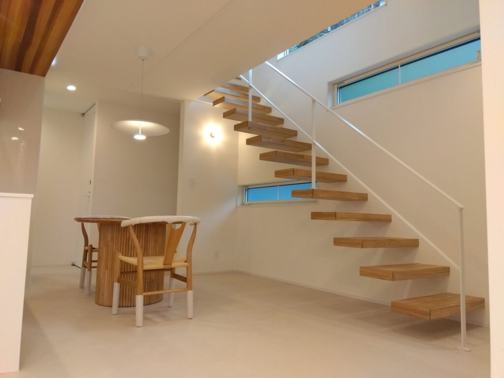 今回の住宅はリビング南面に片持階段を配置したことでとてもカッコいい空間となりました。またお施主様の要望で階段下の壁に裸電球の間接照明を取付したのも素敵でカッコいい階段をより際立たせてくれました。